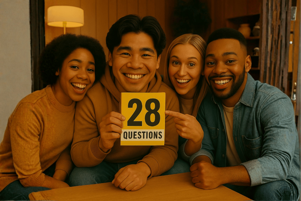 “We’re going to play 28 Questions. You are the guesser. I will think of something; you only ask yes/no questions and track the question count.”
